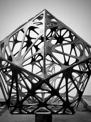 A unique computer aided parametric design, Icosahedron with a continues laser cut triangular patten. It cast a dramatic shadow and is a statement piece whether used as a pendant or table lamp.