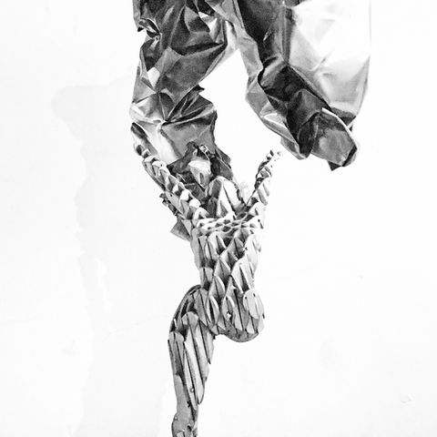 A dancer on one leg caught mid-motion, throwing her hair back. Her elaborate hair trails behind leaving a trail of a crumpled copper sheet. She is made of stainless steel interlacing slices, giving volume and structural strength.